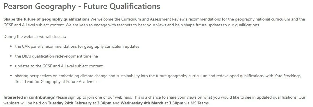 At the end of this month I’m joining the Pearson Geography team for a webinar to share ideas, thoughts and perspectives on future qualifications and what these might look like.