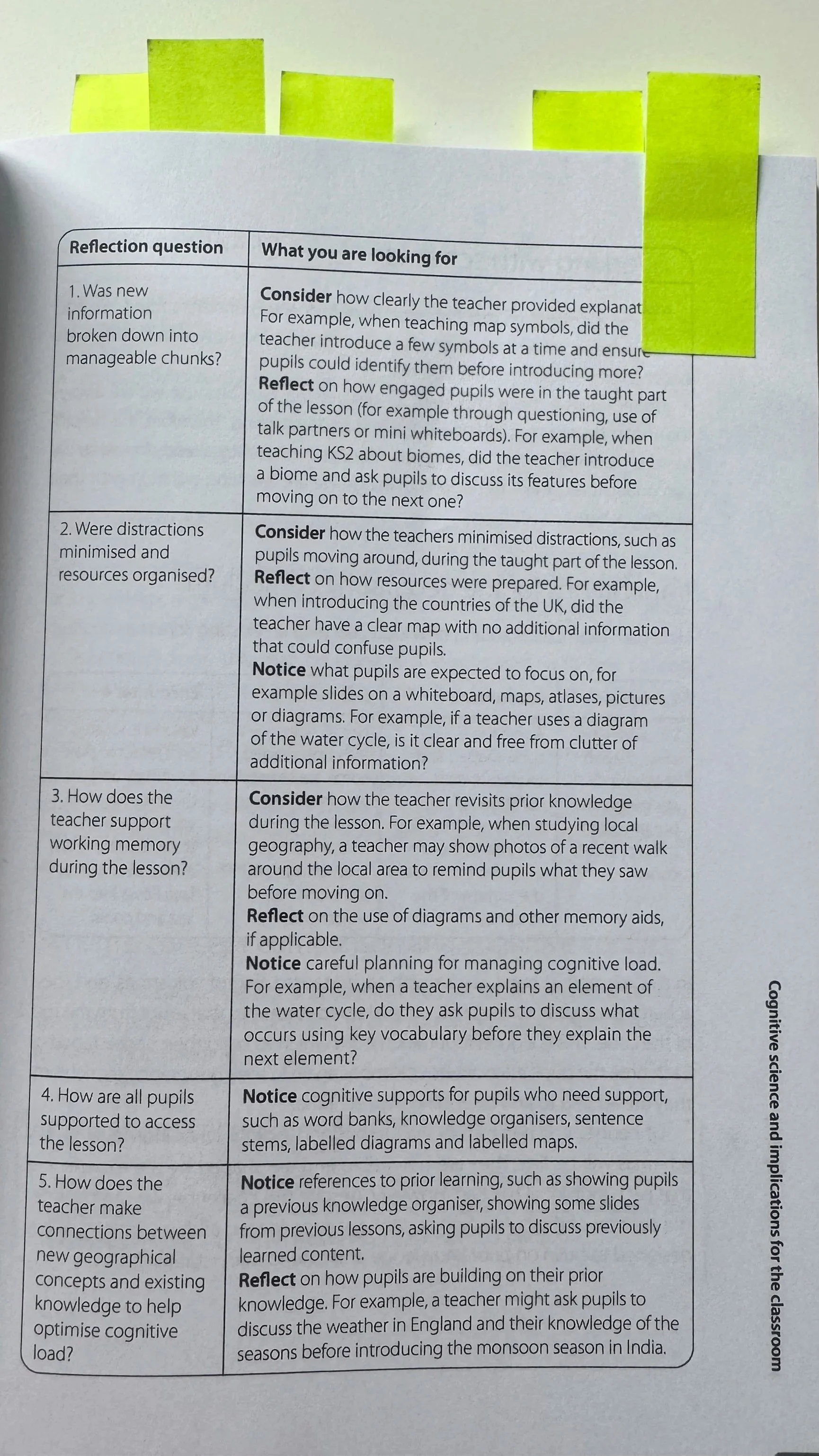 Throughout the book there are very useful tables that provide guidance for how to put the theory and research into practice. Whilst primary examples are obviously used in the tables, the content and reflection questions are equally as valuable in a secondary setting. So, I’ll be taking a few and adding them to my training resources. For example, I’ll be using the table on p.27 (the second photo below) with our trainees to consider how to manage cognitive load in a geography classroom. I will also be using the table from p.70 about how to introduce new vocabulary in geography and the table from p.72-73 about ideas for scaffolding writing.
